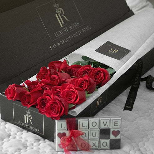 VALENTINE´S DAY RED ROSES LUXURY BOX WITH CHOCOLATE