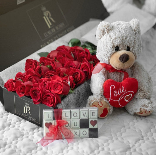 RED ROSES LUXURY BOX, TEDDY & CHOCOLATE