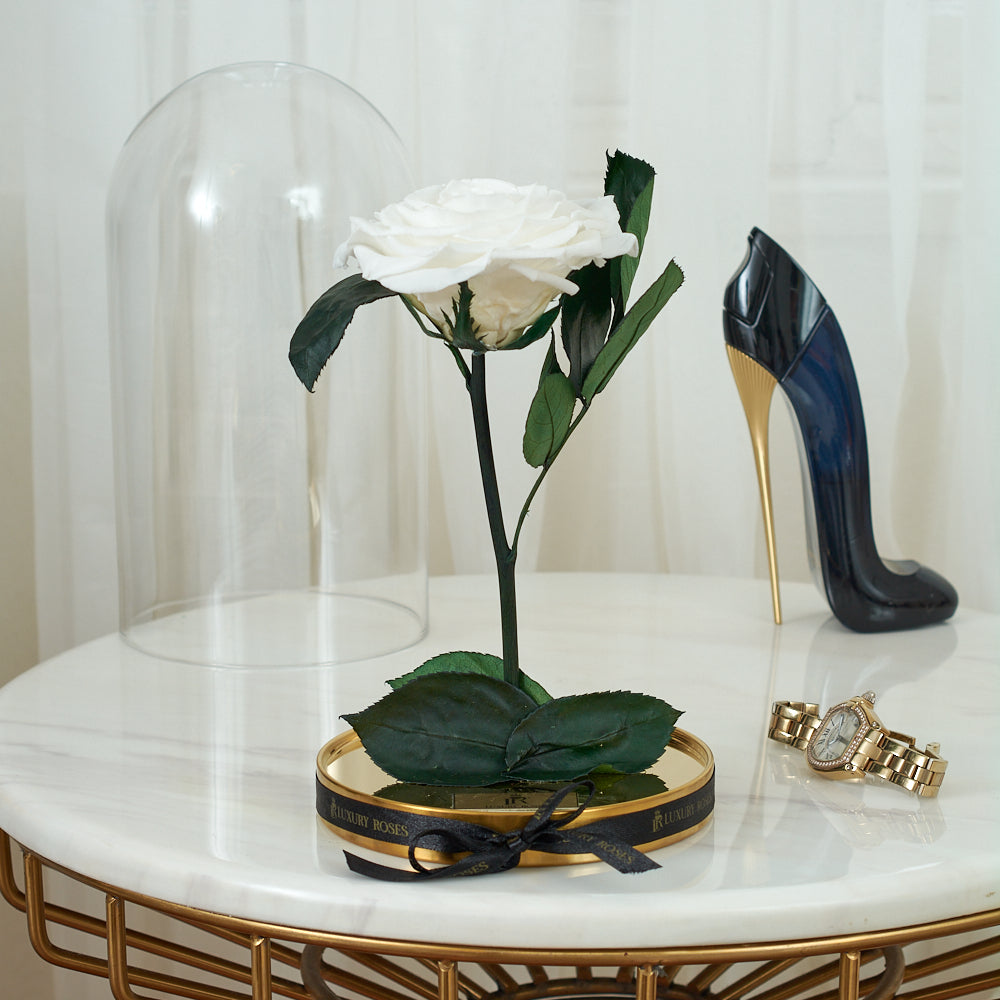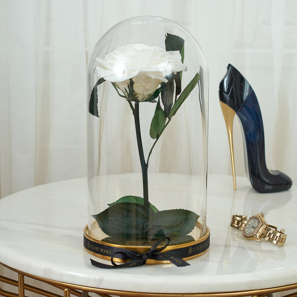 Our Long Lasting White Rose in a Large Gold Dome is the perfect gift to be remembered forever. It is a real rose that last more than 3 years and represents an enduring symbol of love, appreciation and celebration in our lives; inspired by the most memorable fairytale beauty and the beast; presented in a clear and elegant glass dome, surrounded by fallen petals; designed to bring lasting beauty into your life.