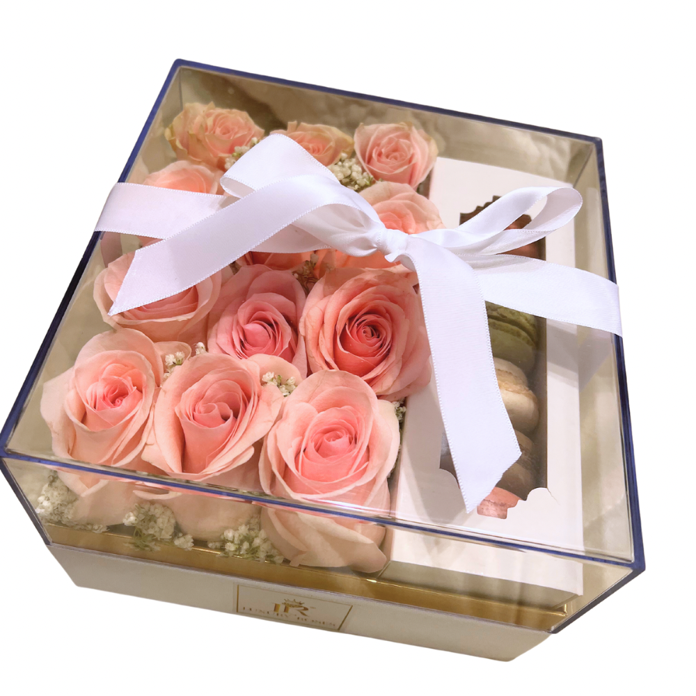 The perfect treat for your loved one. A delicate arrangement and unique design with fifteen beautiful fresh roses accompanied with a delicious and testy macaroons, presented in an elegant and luxury box.